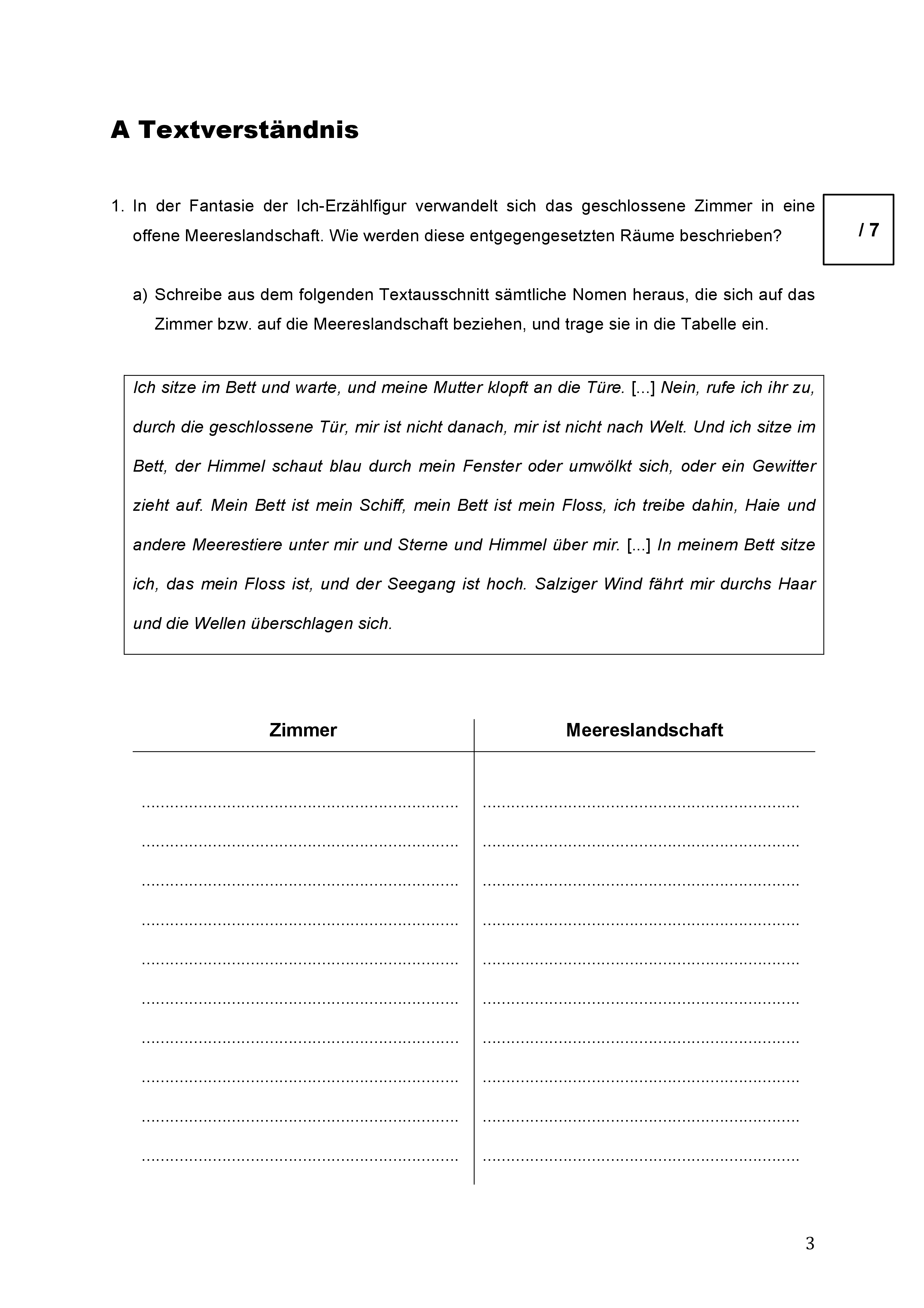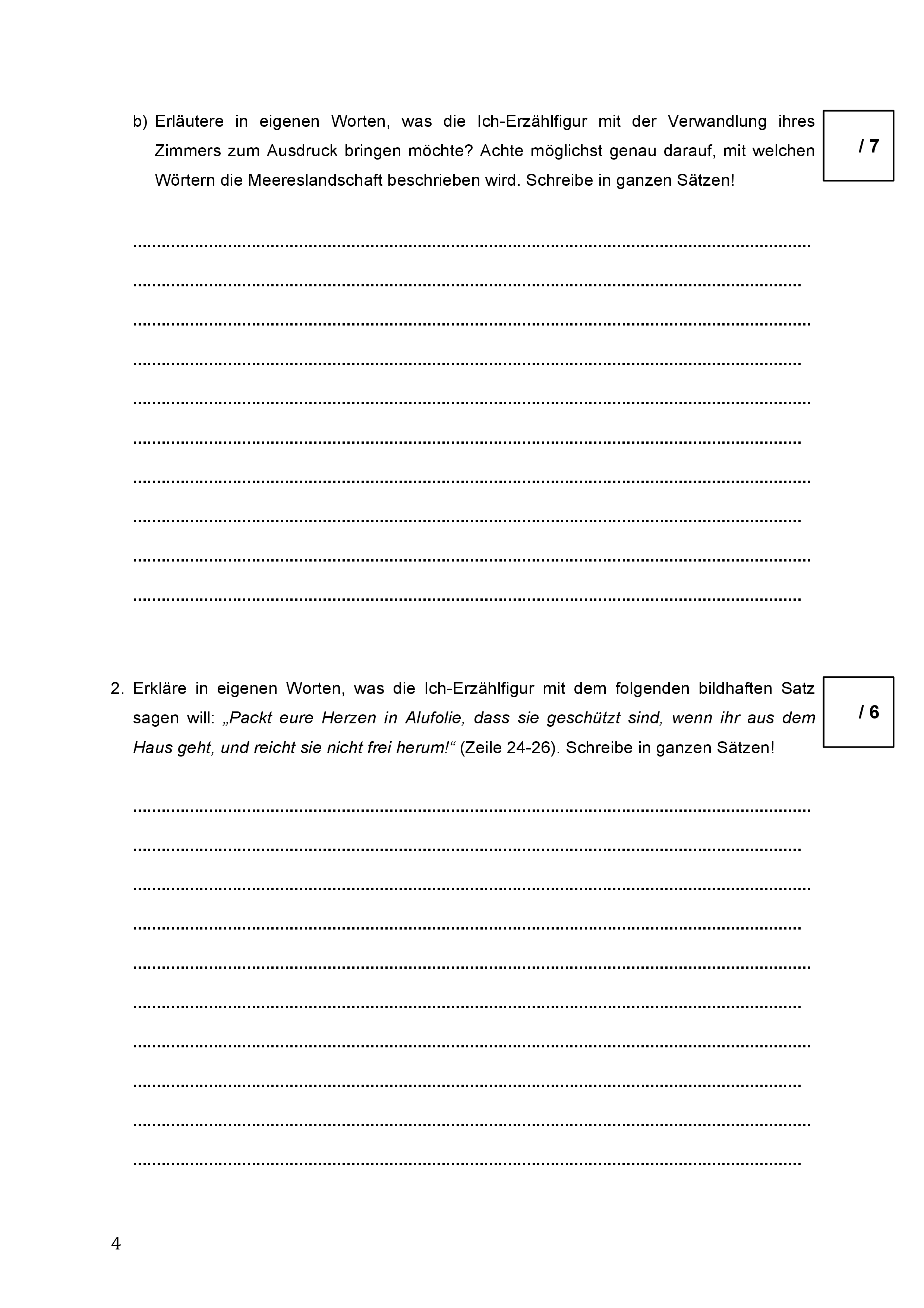 Erläutere in eigenen Worten, was die Ich-Erzählfigur mit der Verwandlung ihres Zimmers zum Ausdruck bringen möchte? Achte möglichst genau darauf, mit welchen Wörtern die Meereslandschaft beschrieben wird. Schreibe in ganzen Sätzen!