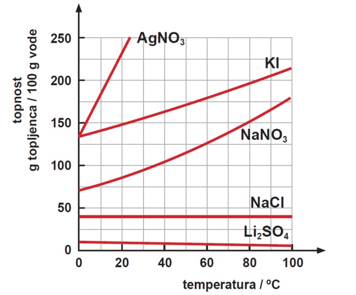 Pri 10°C je v primerjavi z ostalimi najslabše topen natrijev klorid.