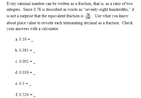 Every rational number can be written as a fraction, that is, as a ratio of two integers. Since 0.78 is described in words as “seventy-eight hundredths,” it is not a surprise that the equivalent fraction is 78/100. Use what you know about place value to rewrite each terminating decimal as a fraction. Check your answers with a calculator.