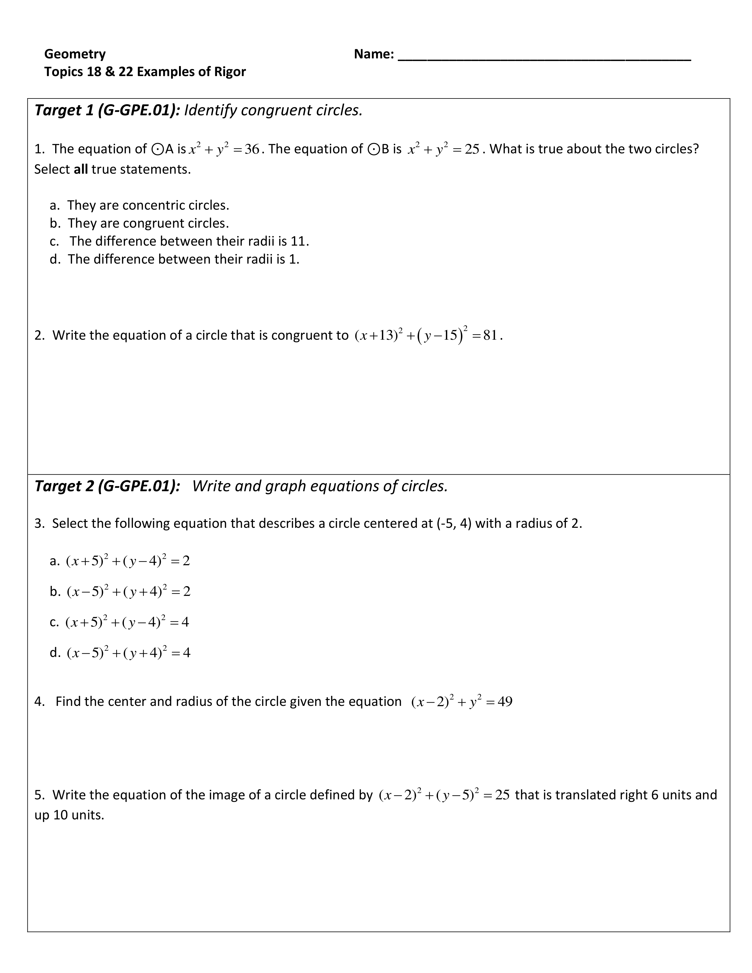 F) Center (2, 0) and r = 7