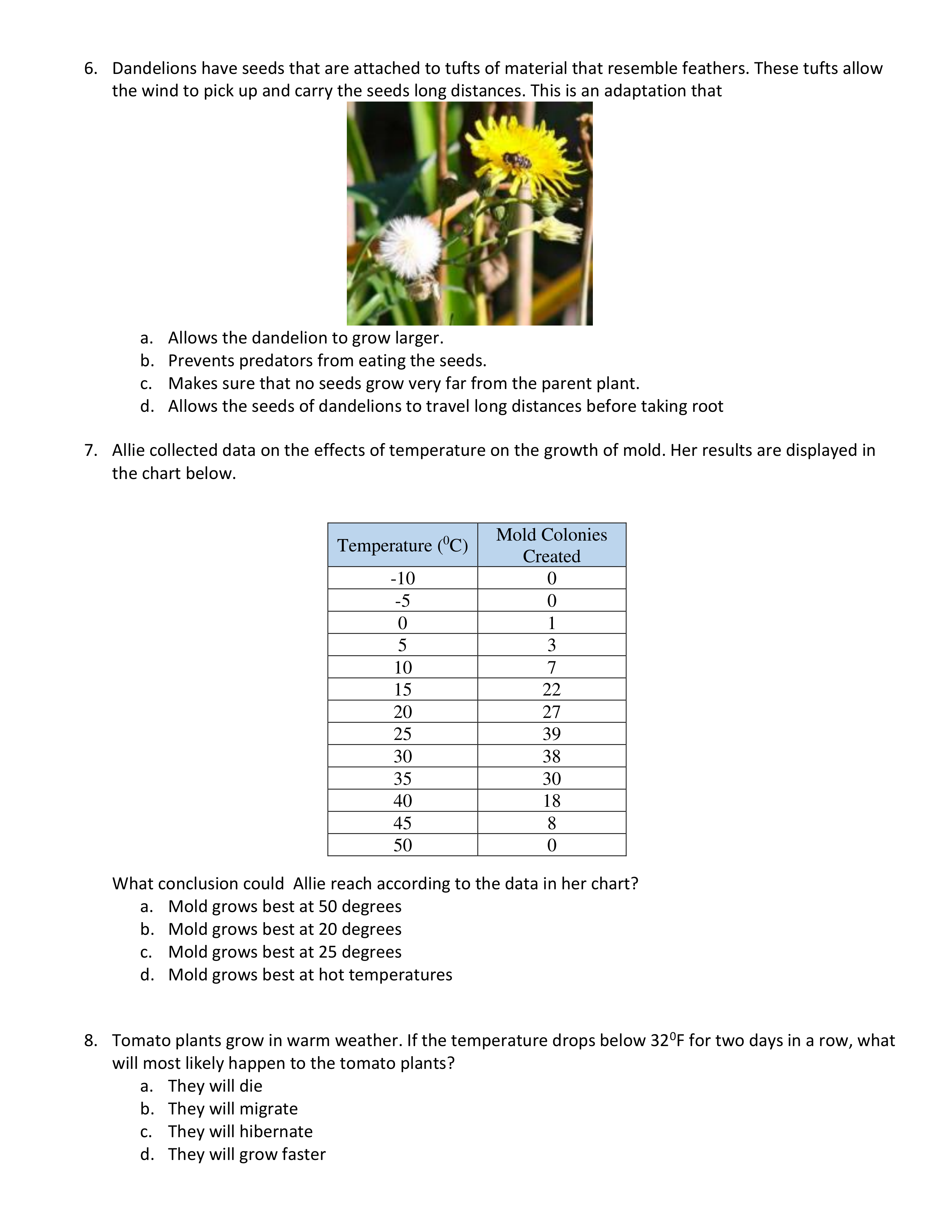 Allie collected data on the effects of temperature on the growth of mold. Her results are displayed in the chart below.
