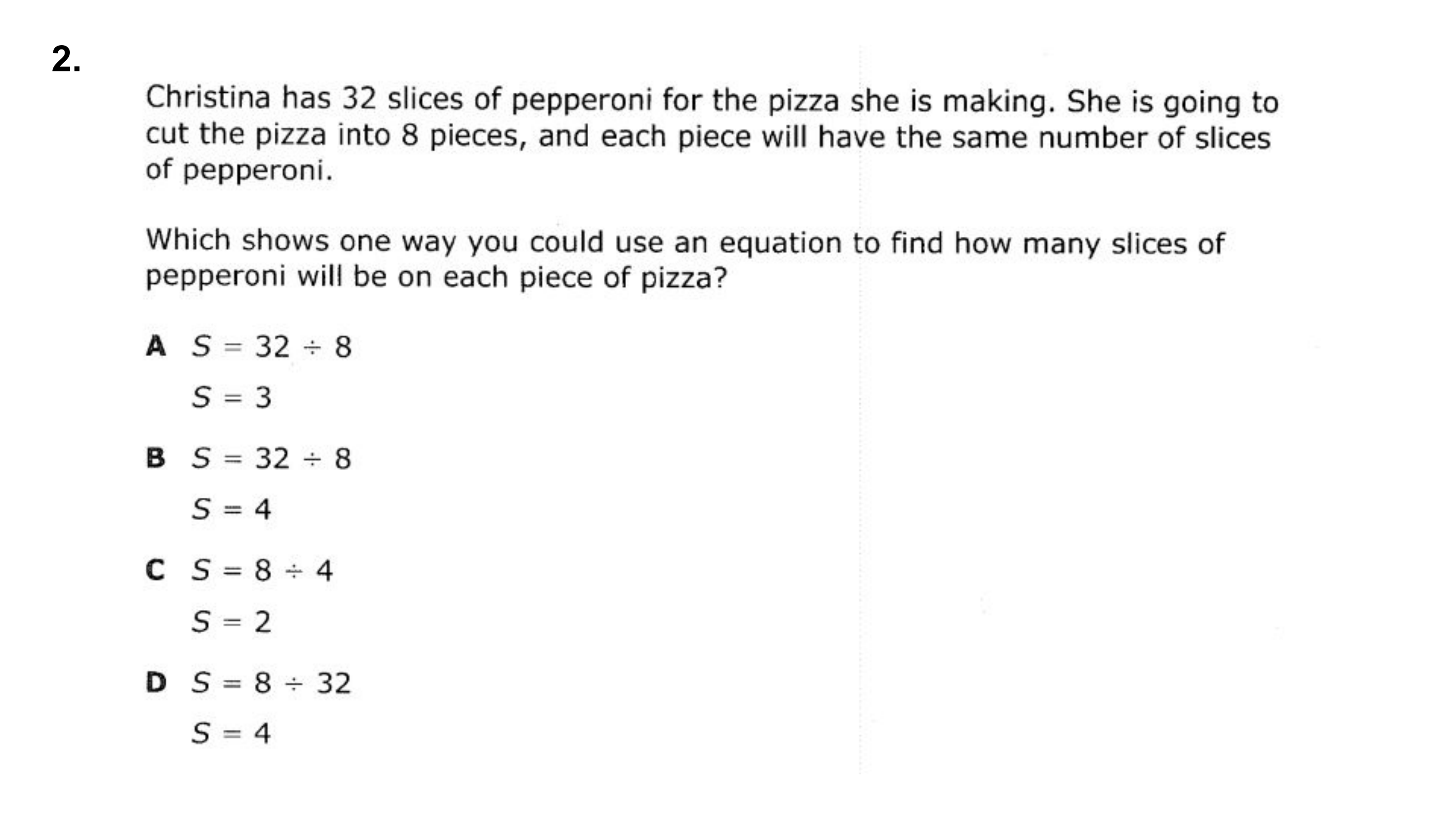 Which shows one way you could use an equation to find how many slices of pepperoni will be on each piece of pizza?