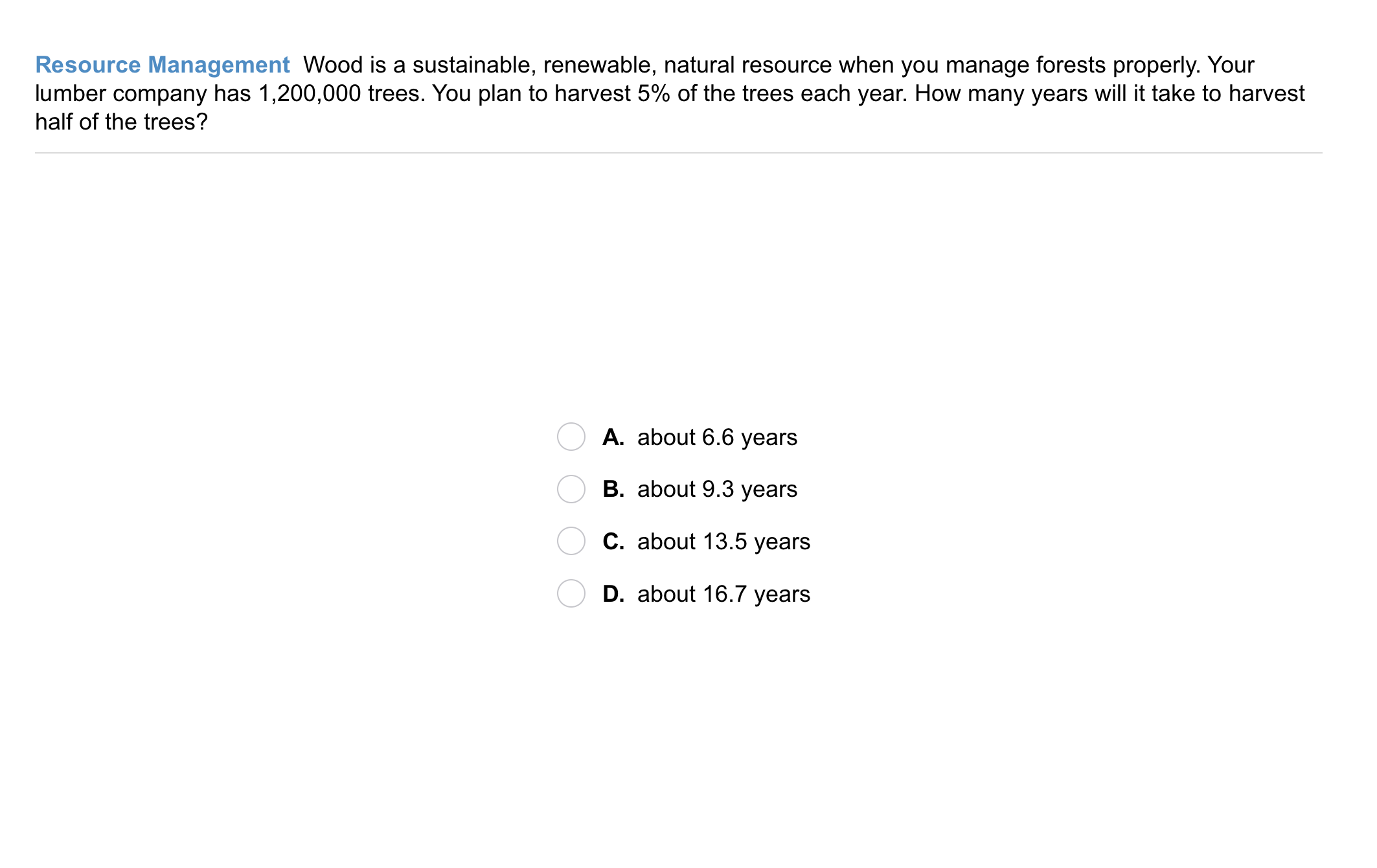 Problem 4 Got It?Resource Management: Wood is a sustainable, renewable, natural resource when you manage forests properly. Your lumber company has 1,200,000 trees. You plan to harvest 5% of the trees each year. How many years will it take to harvest half of the trees?