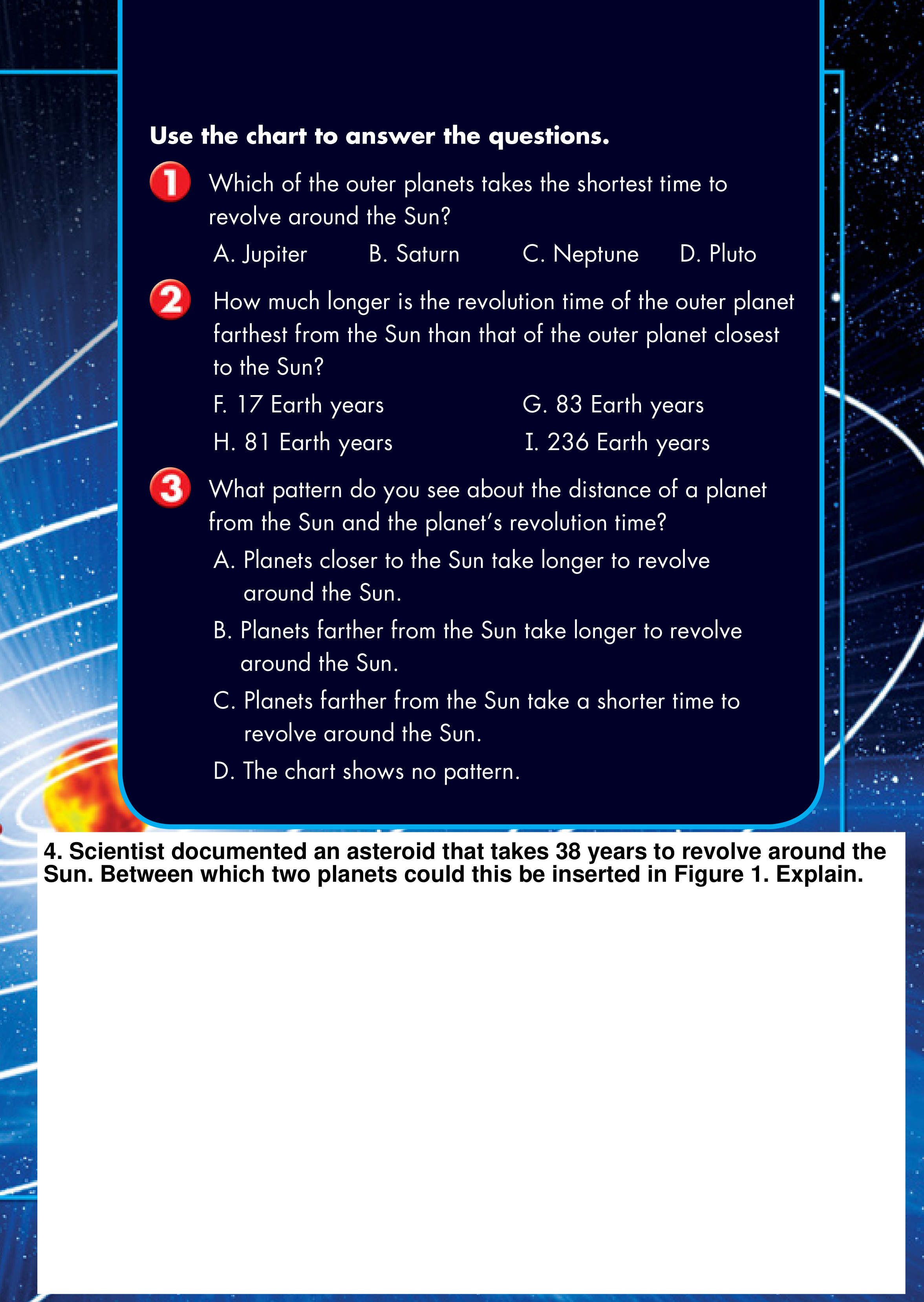 Scientist documented an asteroid that takes 38 years to revolve around the Sun. Between which two planets could this be inserted in Figure 1. Explain.