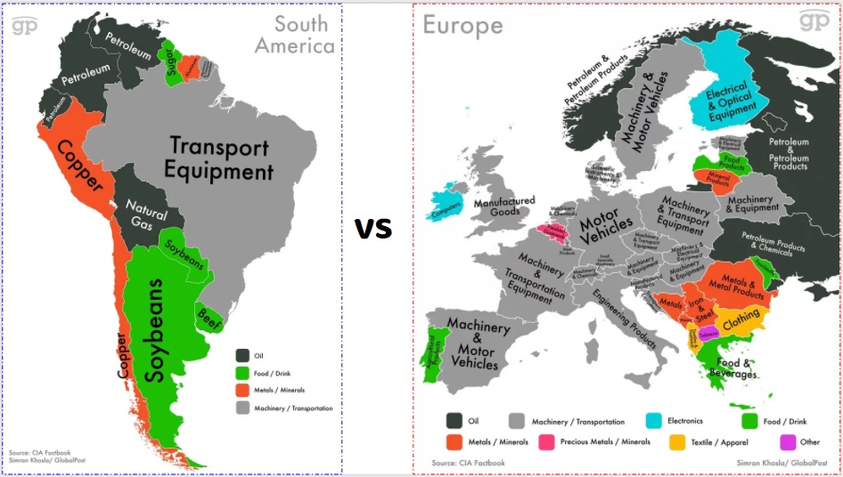 Study the diagram above. Explain how there is a contrast between developing countries in South America and developed countries in Europe in terms of trade and power. Use the term equity in your answer.