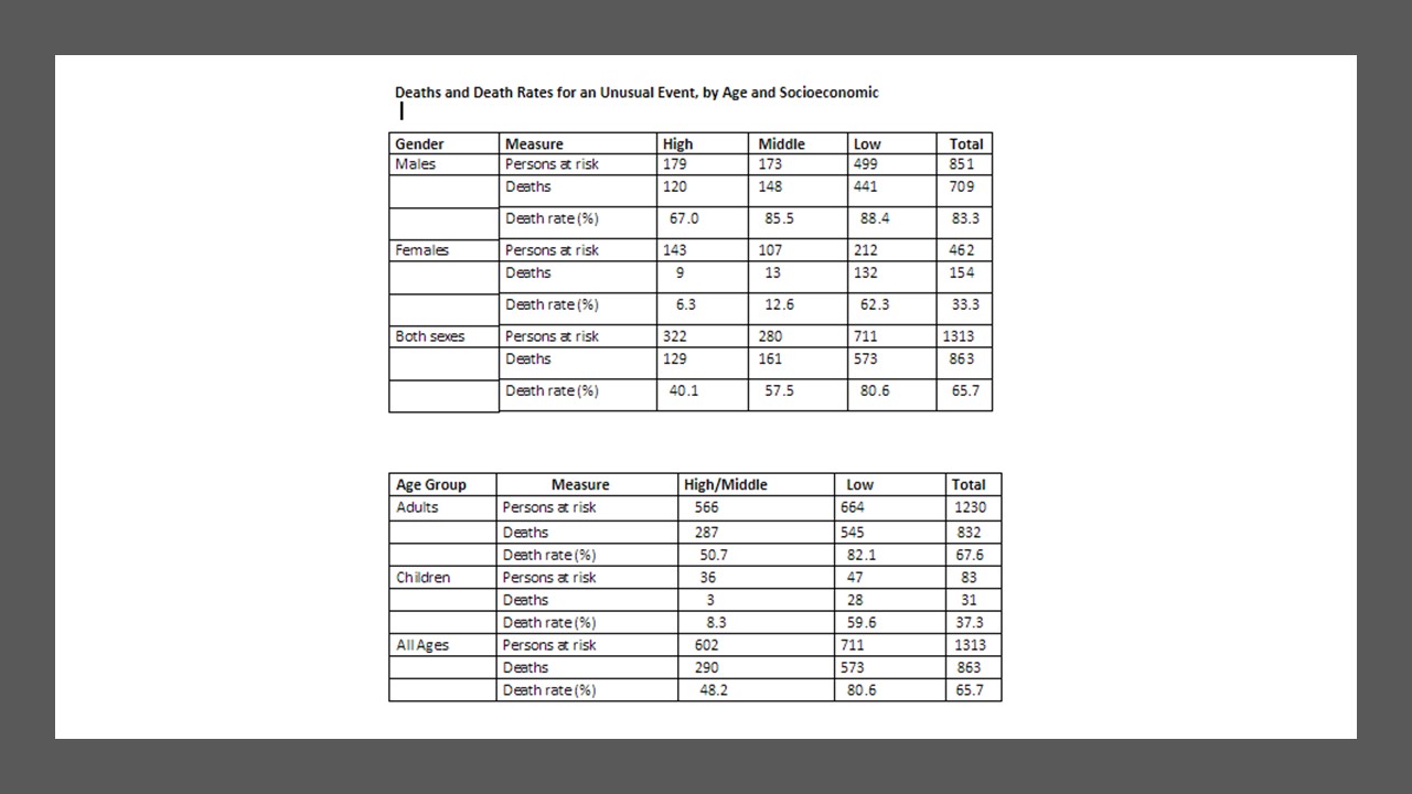 Using the data in Tables below describe the death rate patterns for the “Unusual Event.” For example, how do death rates vary between men and women overall, among the different socioeconomic classes, among men and women in different socioeconomic classes, and among adults and children in different socioeconomic classes? Can you guess what type of situation might result in such death rate patterns?