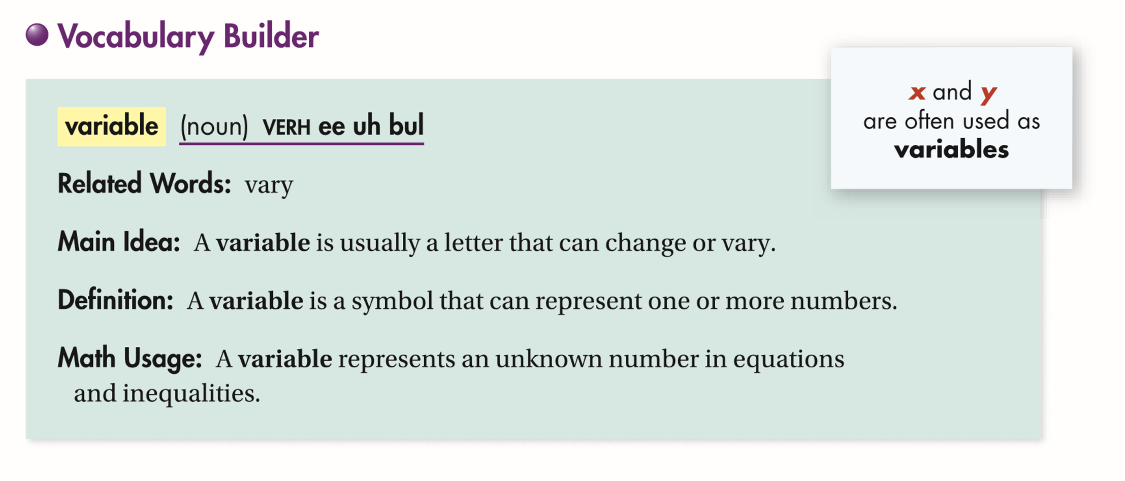 Use Your Vocabulary: Circle the variables in each algebraic expression on the canvas. Use a color other than black.