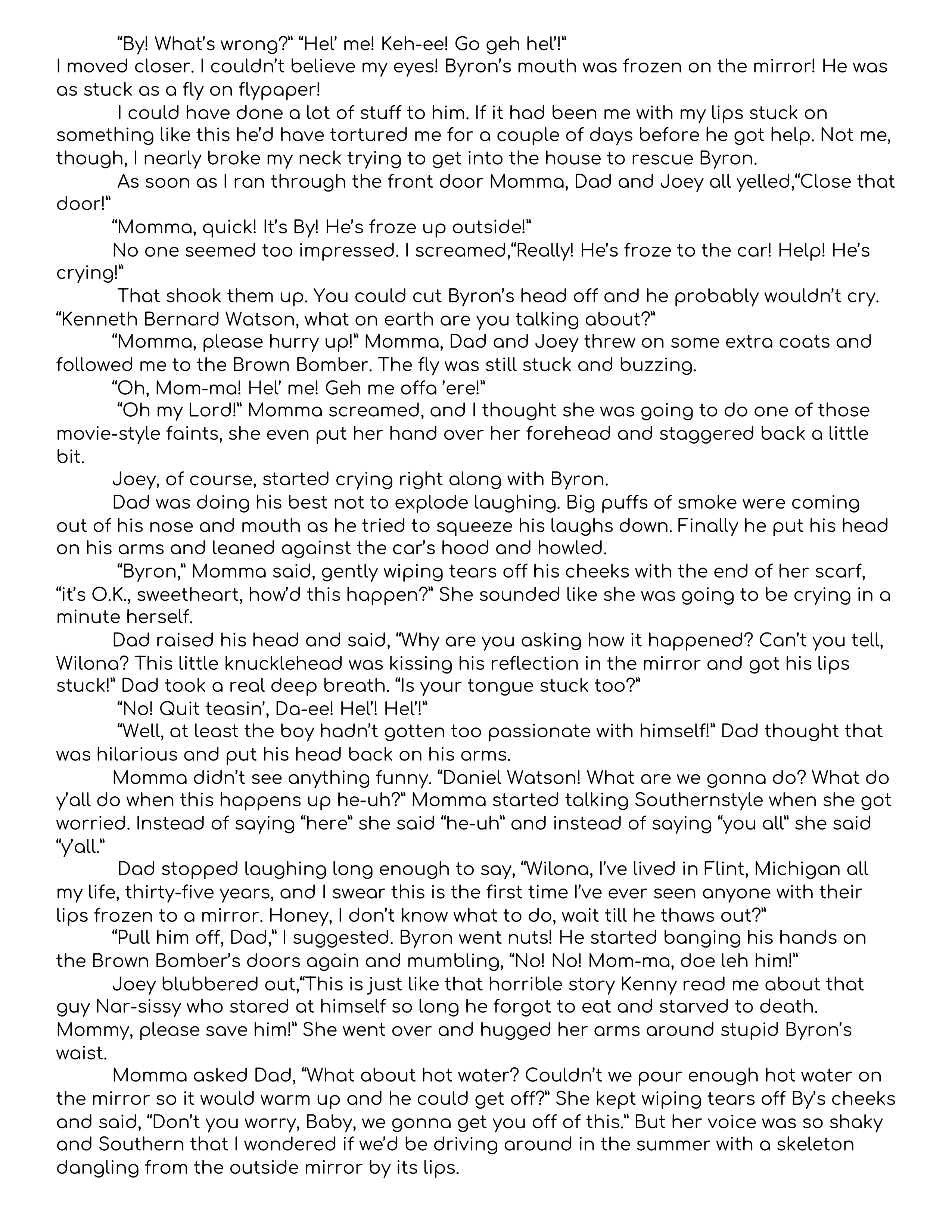 What part of STEAL is being demonstrated? “Byron,” Momma said, gently wiping tears off his cheeks with the end of her scarf, “it’s O.K., sweetheart, how’d this happen?” She sounded like she was going to be crying in a minute herself.