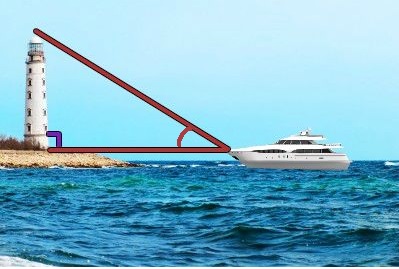 Een vuurtoren is 200 meter hoog. Een boot ligt op 300 meter afstand in zee. Een bootmedewerker staat op het puntje van de boot en kijkt naar de top van de vuurtoren. Onder welke hoek doet hij dat? Rond af op hele graden.