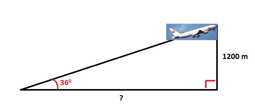 Een vliegtuig stijgt op onder een hoek van 36 graden gaat gelijkmatig naar boven. Welke afstand heeft het vliegtuig afgelegd zodra het op 1200 meter hoogte vliegt? Geef je antwoord in hele meters.