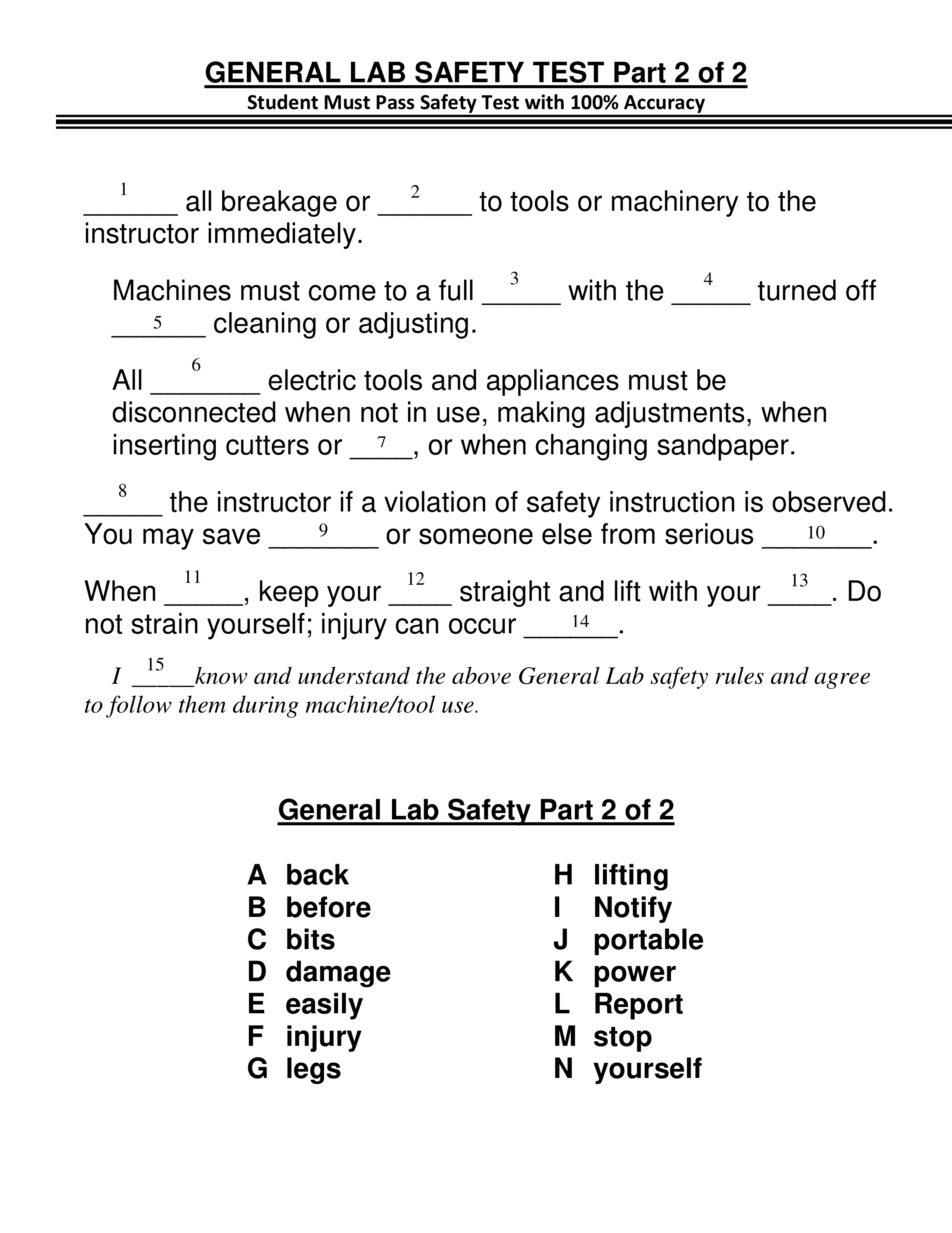 Type your first & last name AND Student Id in the answer box. By doing so you agree that you know & understand the General Lab Safety Part 2 rules and agree to follow them during machine/tool use. MUST ANSWER OR TEST IS VOIDED.