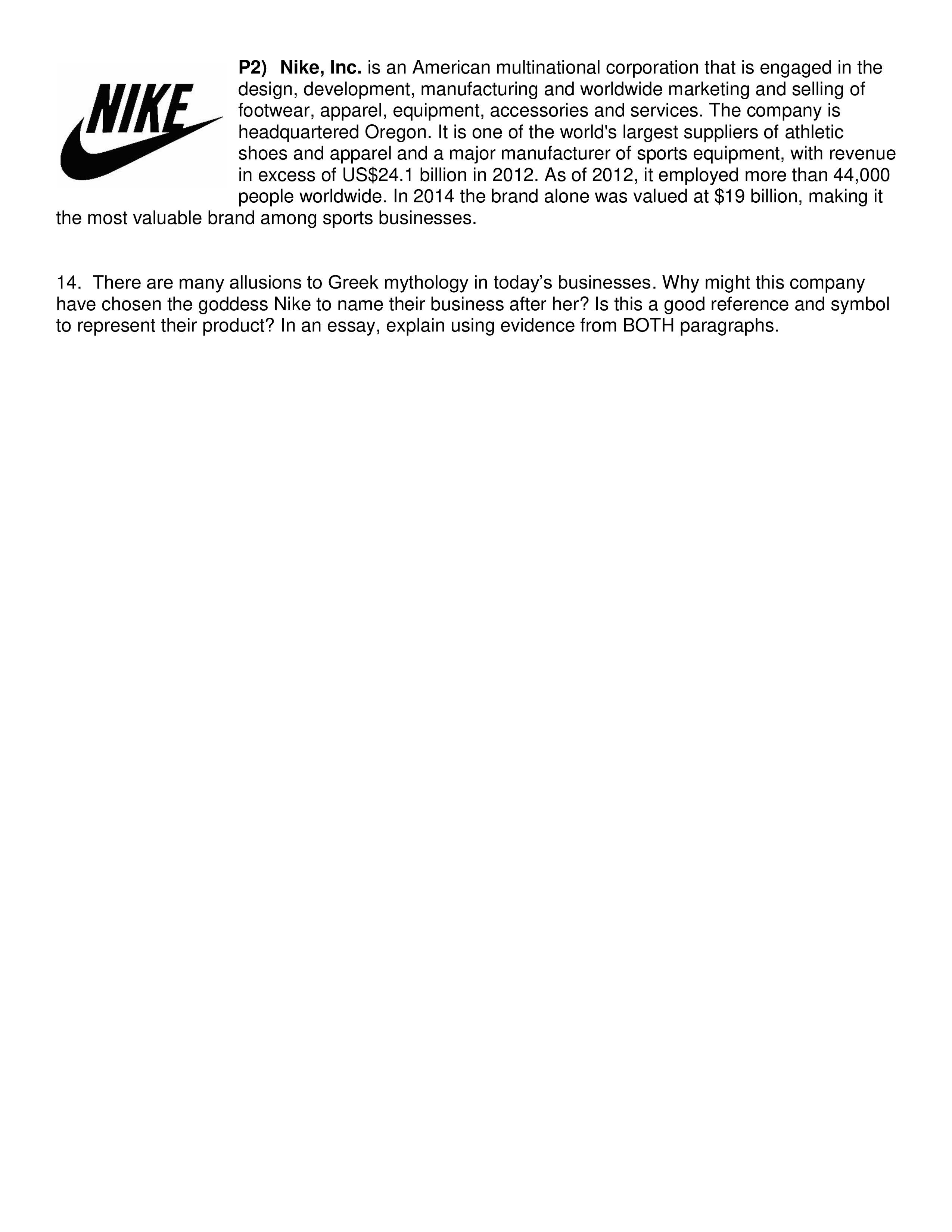 There are many allusions to Greek mythology in today's businesses. Why might Nike, Inc. chosen to use the goddess Nike as the name of their company? Is this a good reference and symbol to represent their product? In an essay, explain you answers using evidence from BOTH paragraphs. (Use the RACE strategy.)