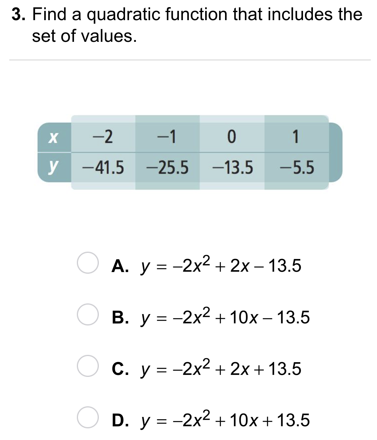 Find a quadratic function that includes the set of values.
