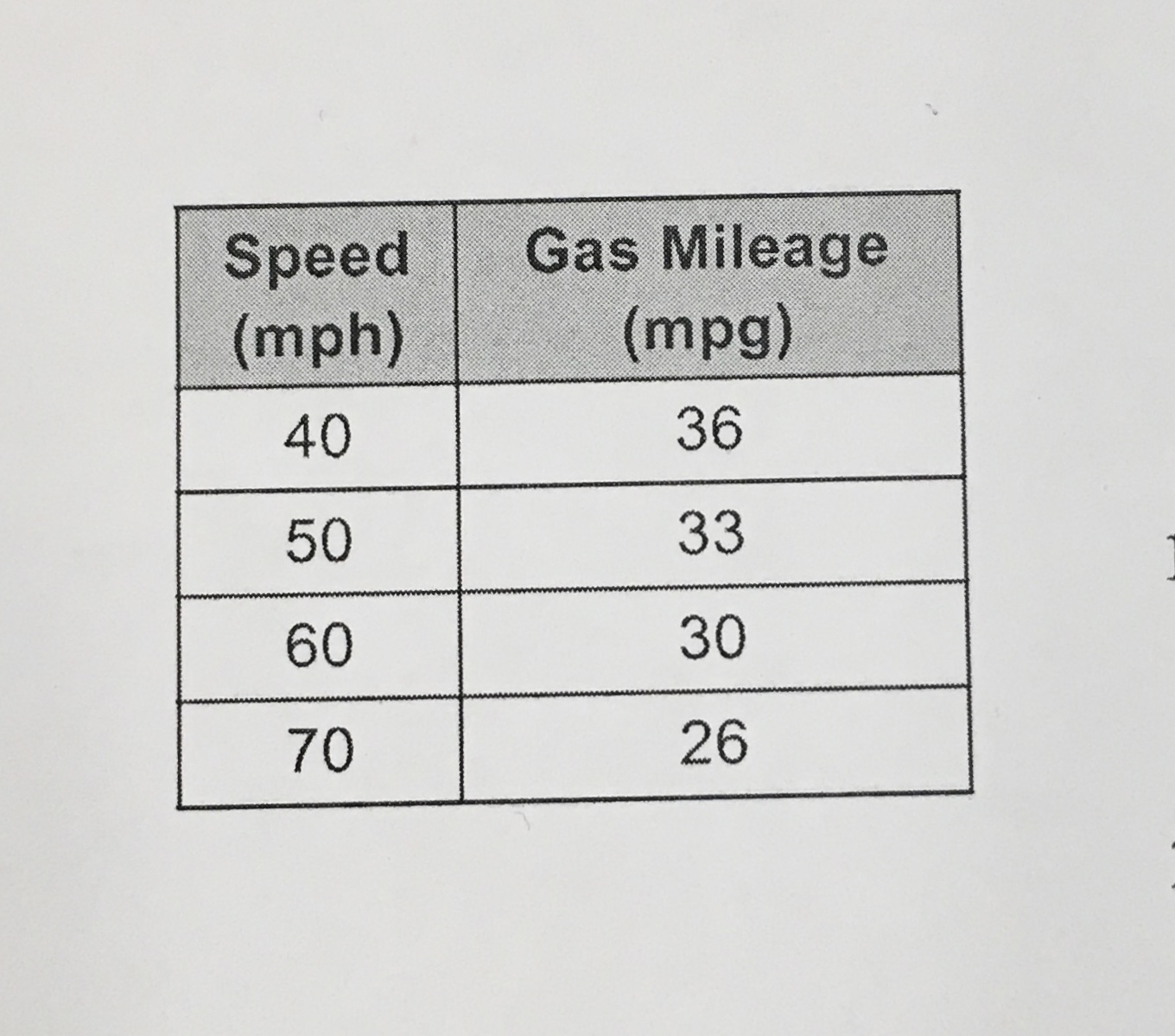 The table shows how speed affects the gas mileage of one type of compact car. Is the relation a function? EXPLAIN. Describe how gas mileage is related to speed.