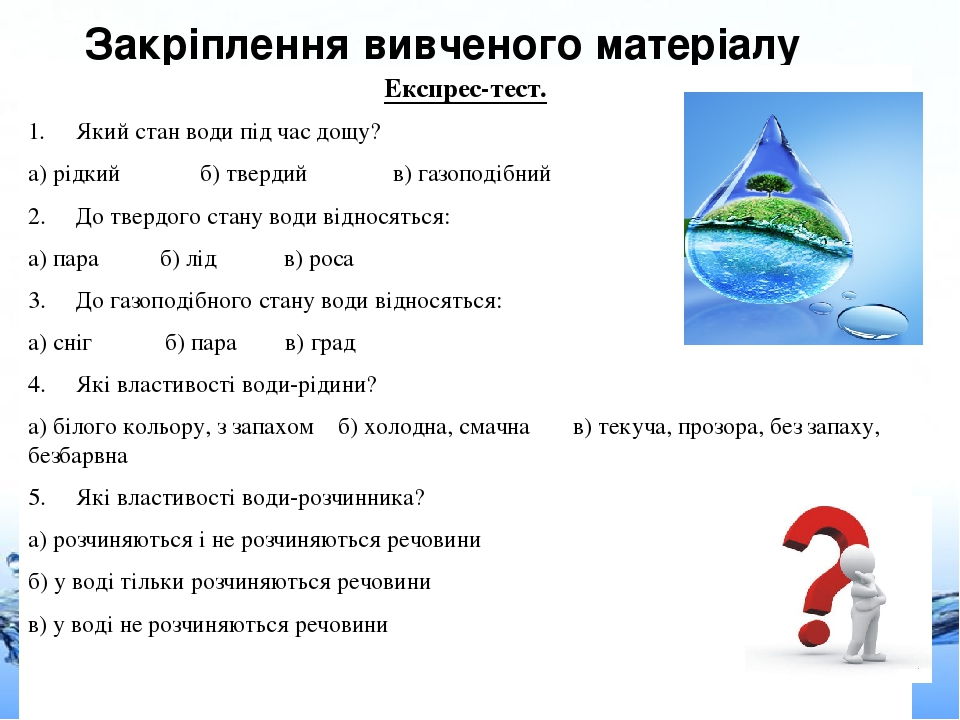 Вода – одне з найцінніших багатств Землі, джерело життя всіх живих організмів. Подивіться на карту світу. Скільки на ній синього і блакитного кольору! Нашу Землю так і називають – Блакитною. Вода вкриває більшу частину поверхні Землі. Земля – єдина з планет Сонячної системи, де є вода. На нашій планеті так багато води, що коли б на неї поглянули прибульці з космосу, вони назвали б її не Землею, а Океаном.