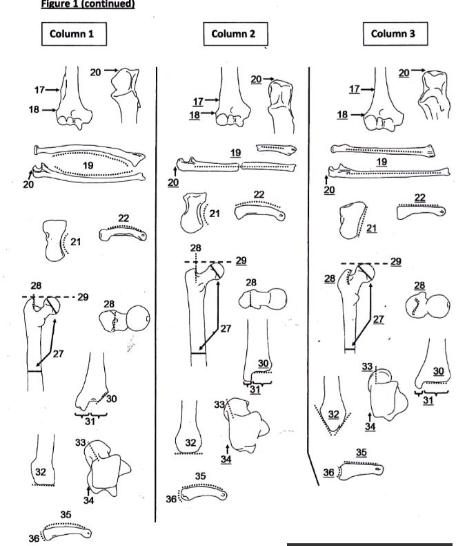 #11-12 Use the figure above. You are an anthropologist and have been asked to compare the recently unearthed fossil remains in Column 2 to two known species represented in Columns 1 and 3.