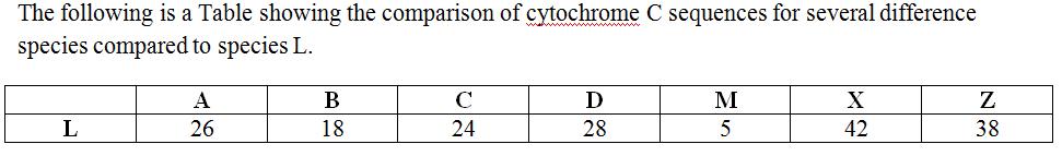 #11-10. Use the Table above. Based on the information in the table, which species is most likely the ancestor to species L?