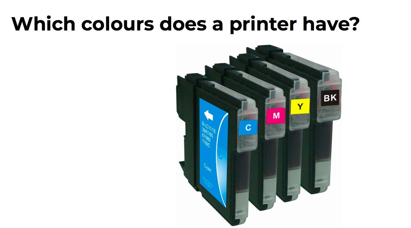 An inkjet printer usually only has four colours of ink: magenta, cyan, yellow and black.