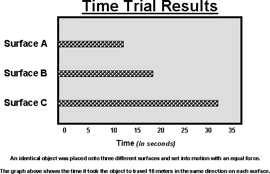 An identical object was placed onto the three different surfaces and set into motion with an identical force. The bars show how fast it took the object to travel 10 meters. Based on the graph, which surface had the greatest friction?