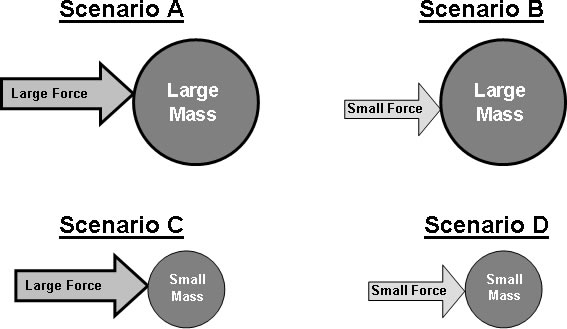 In Scenario A, a ball is being pushed along by a large force. If the force were suddenly decreased (like in Scenario B), what would happen to the motion of the ball?