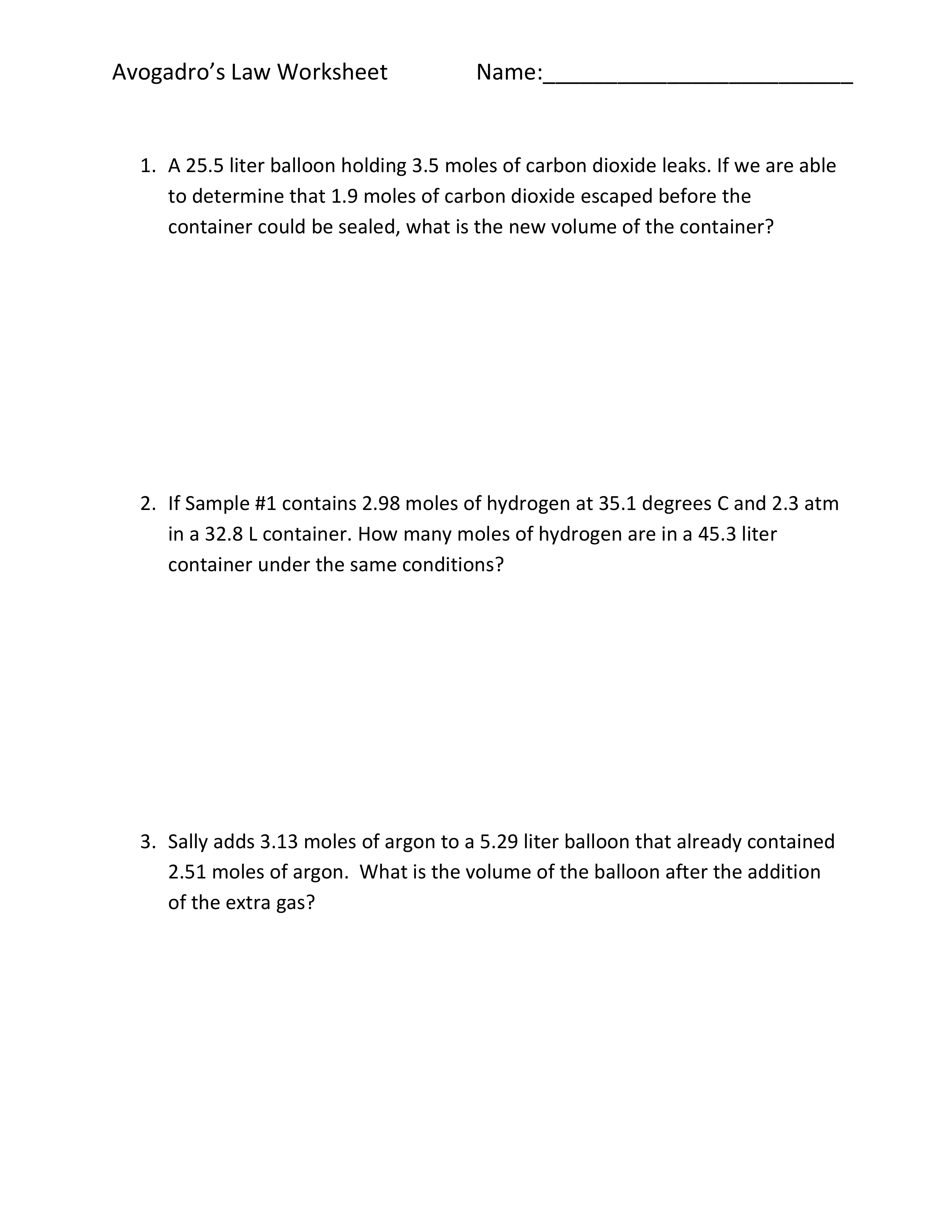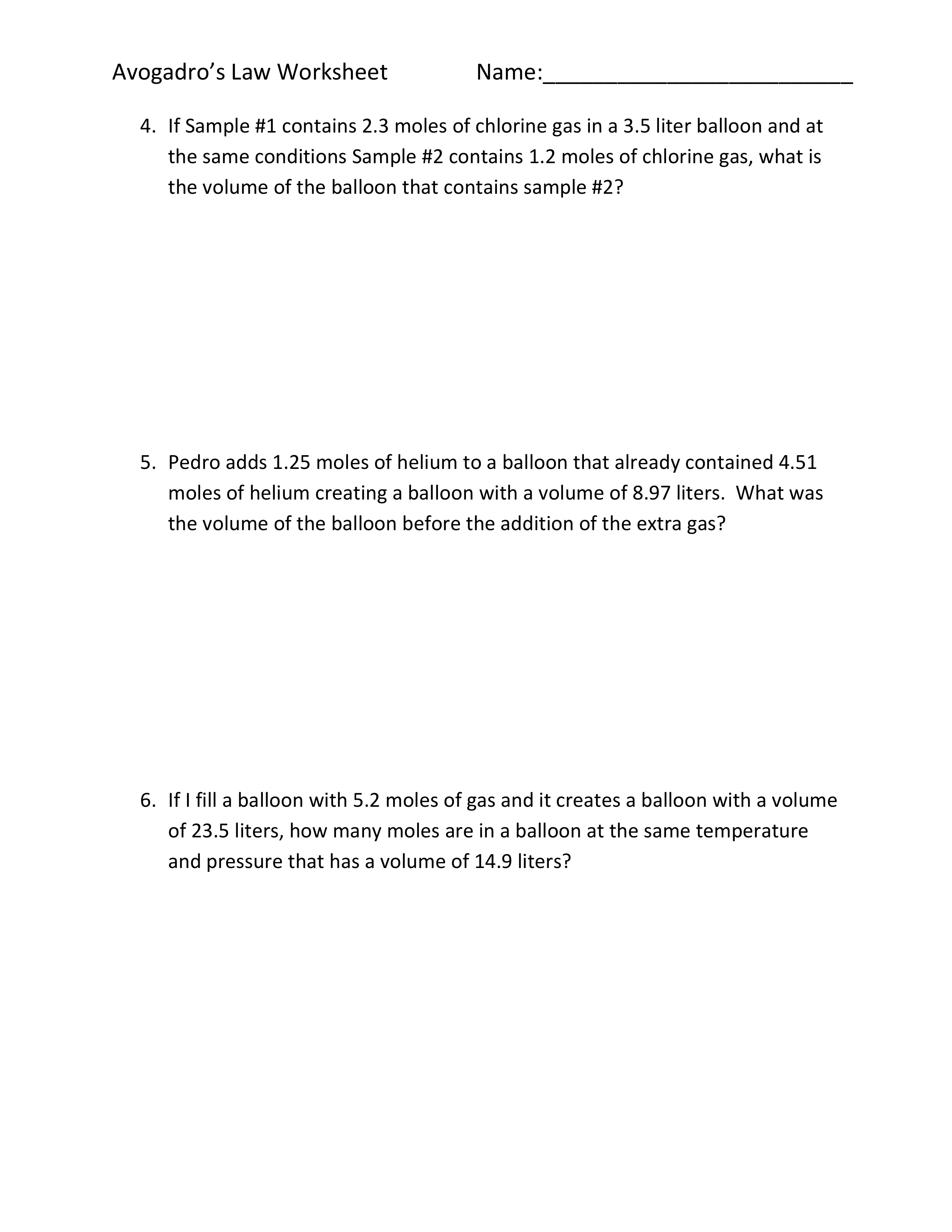 Avogadro's Gas Law WS