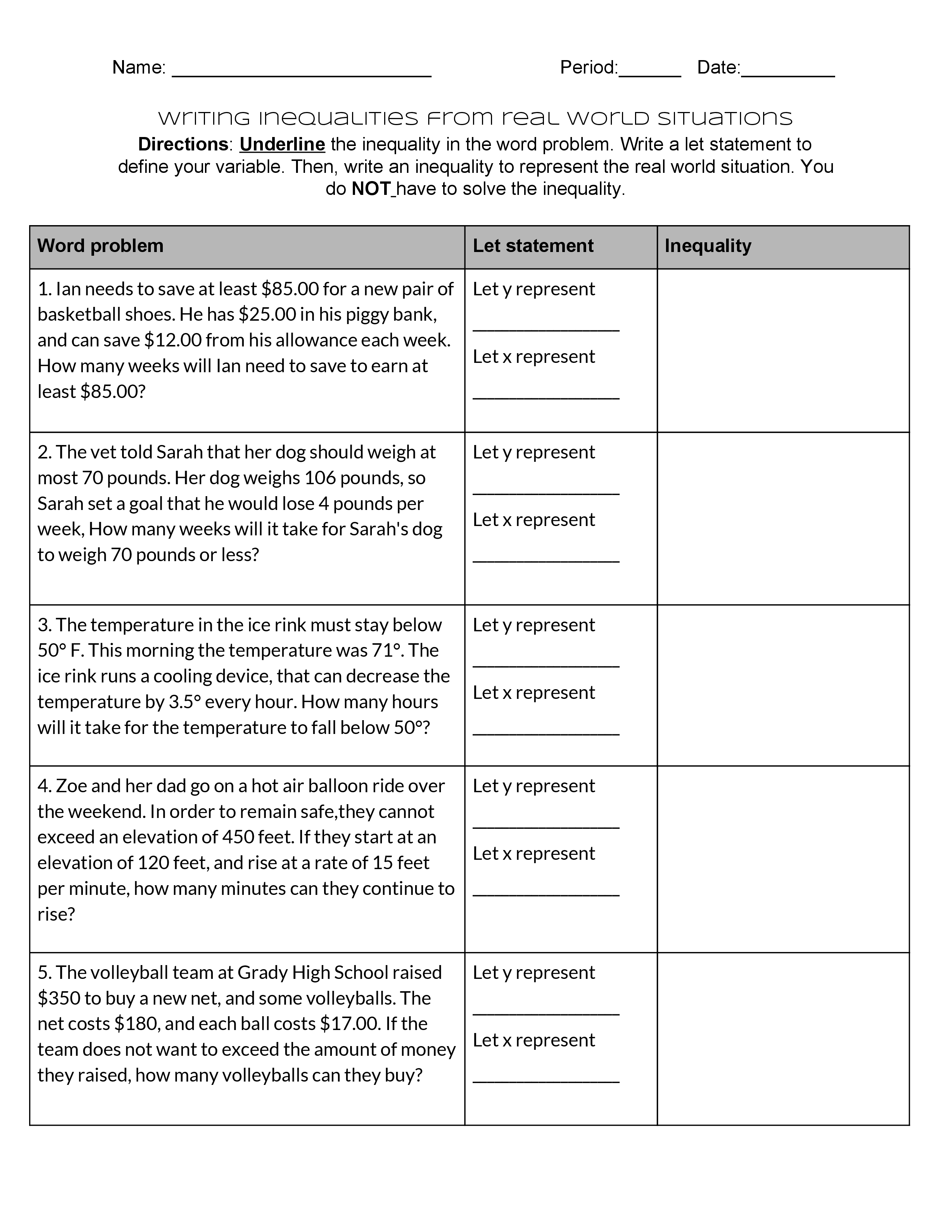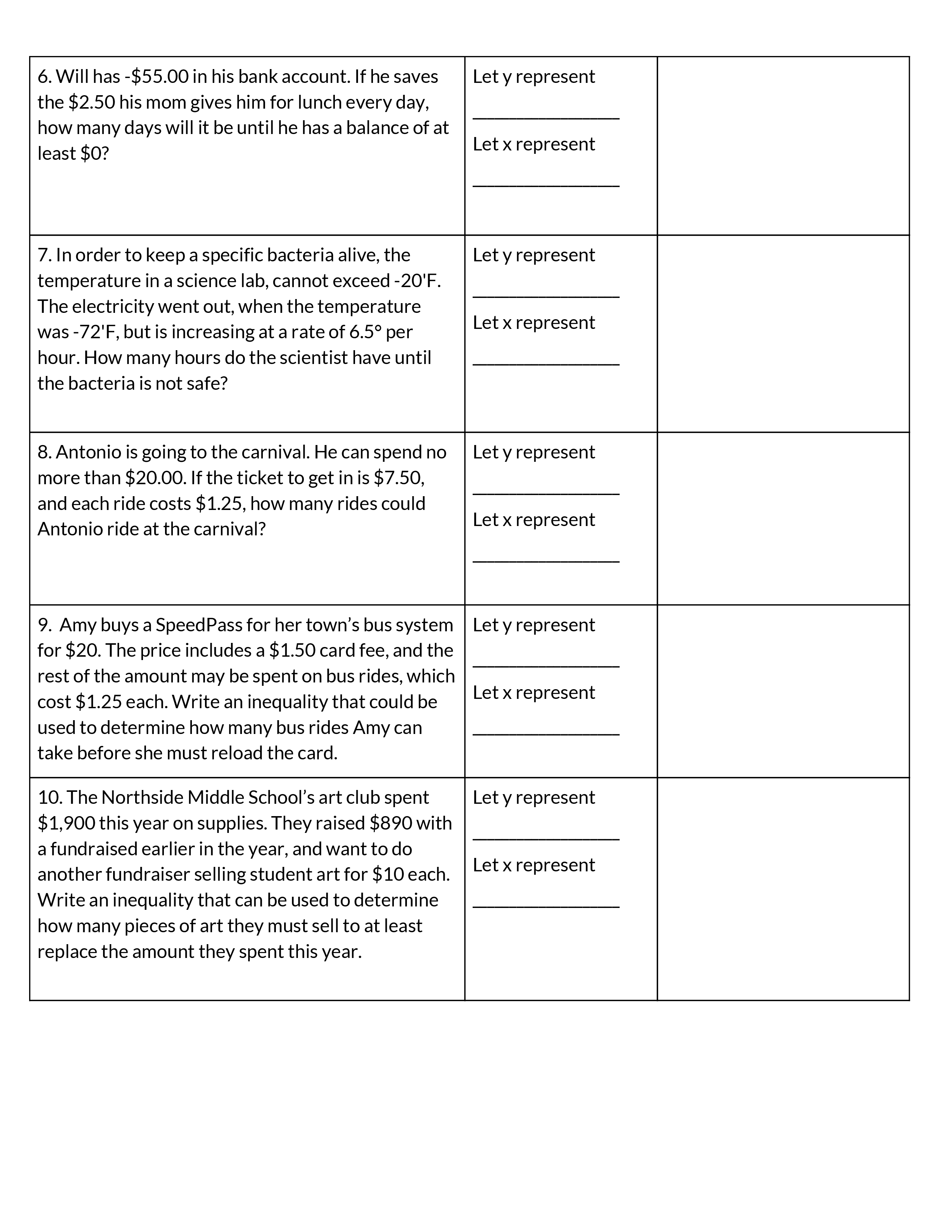 Translating word problems to inequalities, including recognition of dependent and independent variable units.